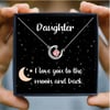 Celebrate your daughter's milestones and moments with this elegant moon-themed pendant necklace, designed to express unconditional love and lasting memories. The delicate moon-shaped pendant, accented with shimmering diamond-like stones, symbolizes protection, care, and a mother's eternal love.