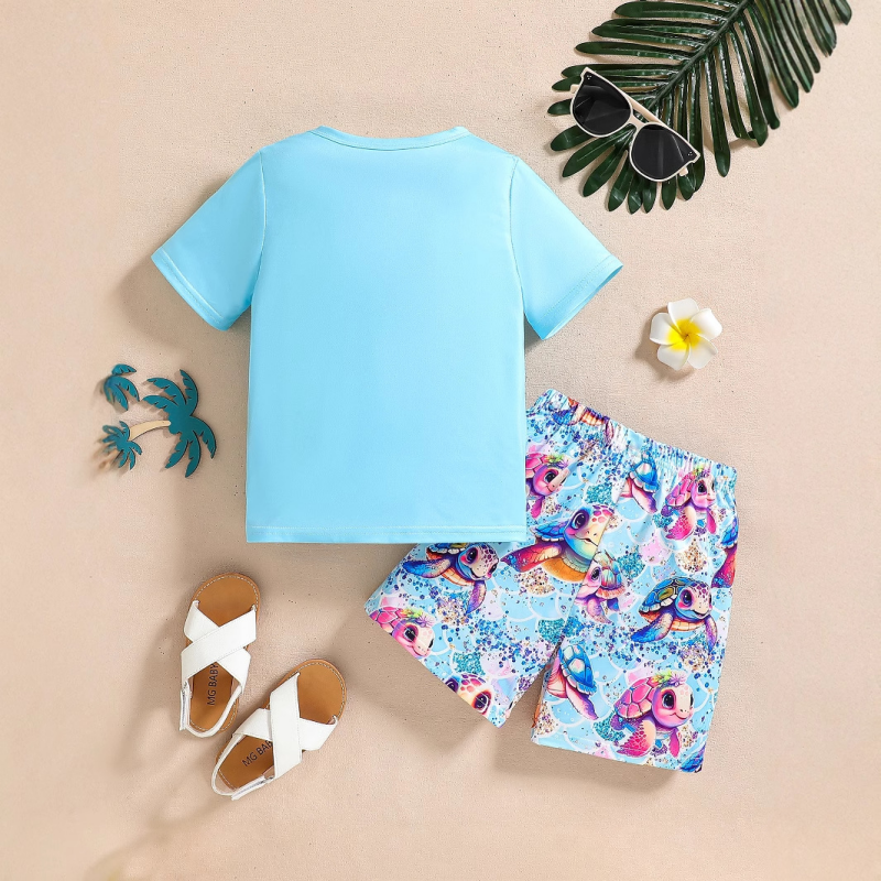 Let your little one shine in this vibrant Turtley Adorable Girls' T-Shirt & Shorts Set! Featuring a cheerful turtle design on a sky-blue short-sleeved tee and colorful matching shorts with playful sea creatures, this outfit is perfect for sunny days, beach outings, and casual fun.