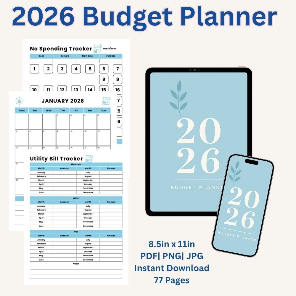 2026 Budget Planner | 77 Pages | 8.5x11 in PDF PNG JPG | Instant Download