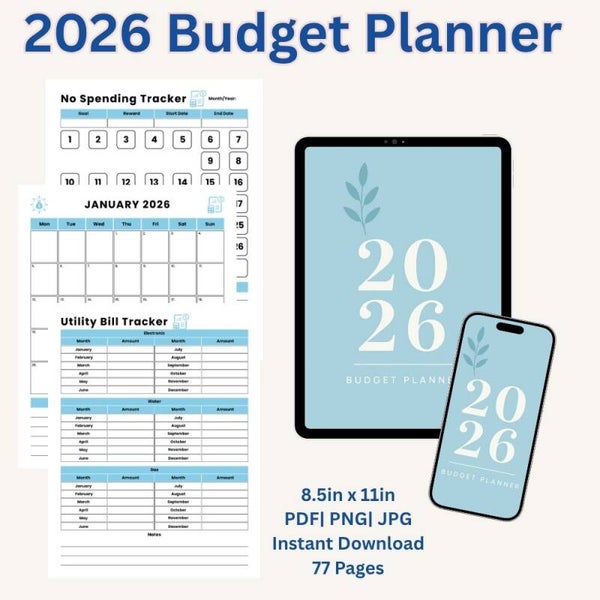 Take control of your finances with this all-in-one 2026 Budget Planner — a printable and digital-ready financial organizer designed to help you budget, save, track, and plan for the year ahead. Sized at 8.5 x 11 inches, this 77-page planner comes in PDF, PNG, and JPG formats for instant download and easy printing.
