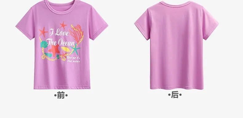 Pure Cotton Summer Girl's T-Shirt | "I Love the Ocean" Cartoon Print | Short Sleeve | 90–140cm | Cute & Breathable