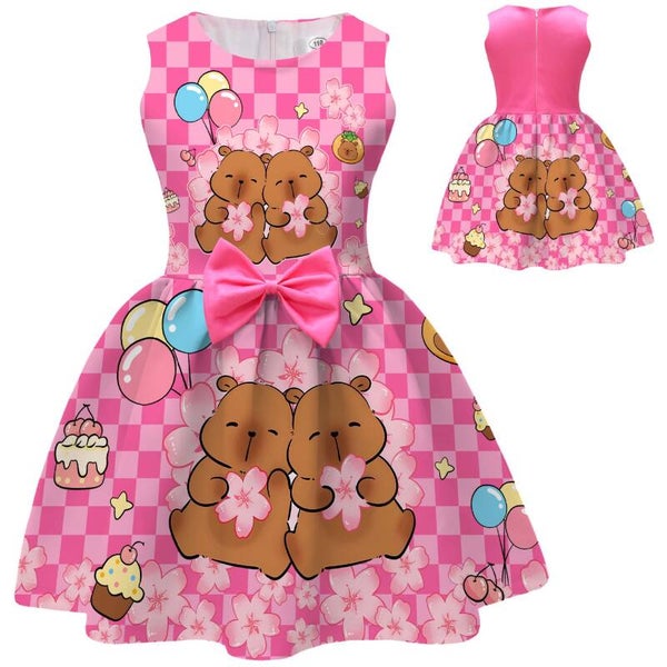 Capybara Print Girls Bow Princess Dress – A-Line Skirt | Ages 3–9Y | Sizes 100–140 | Pink, Rose Red, Purple