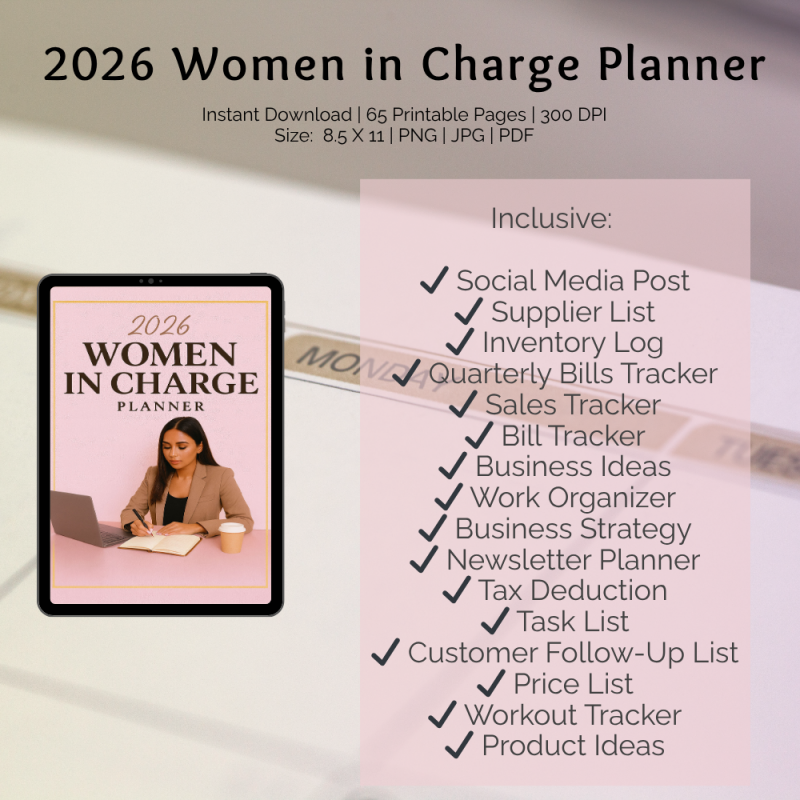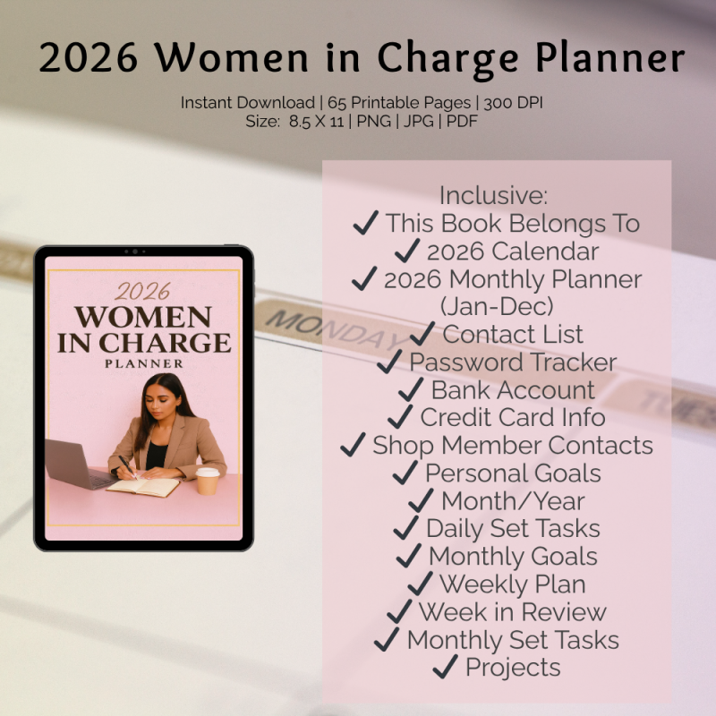 The 2026 Women in Charge Planner is designed to elevate your productivity and bring structure to every area of your professional and personal life. Download instantly and start planning your most successful year yet.