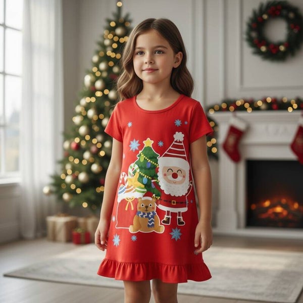 Christmas Dress for Girls – Festive Santa Design, Comfortable Short Sleeve Style, Ages 3–8