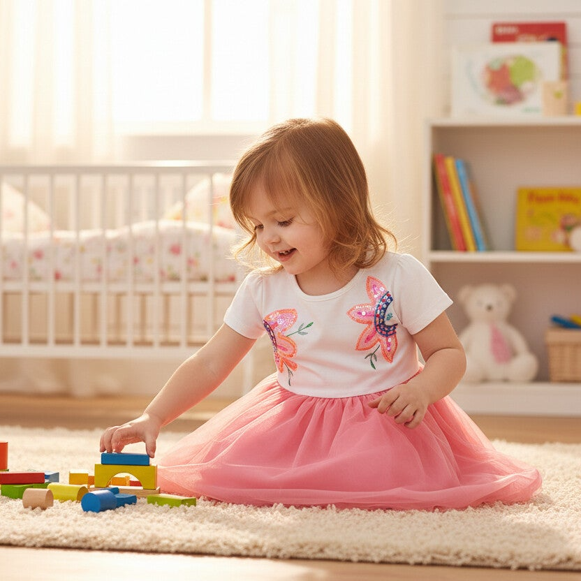 Give your little one a dress she’ll love to wear again and again. With its comfortable cotton fabric, delicate floral sequin details, and lightweight tulle skirt, this dress blends everyday comfort with a touch of princess charm. Perfect for summer outings, celebrations, or casual days, it’s an easy choice for parents who want style, comfort, and quality in one beautiful piece. Add it to your cart today and let your child shine with confidence and joy